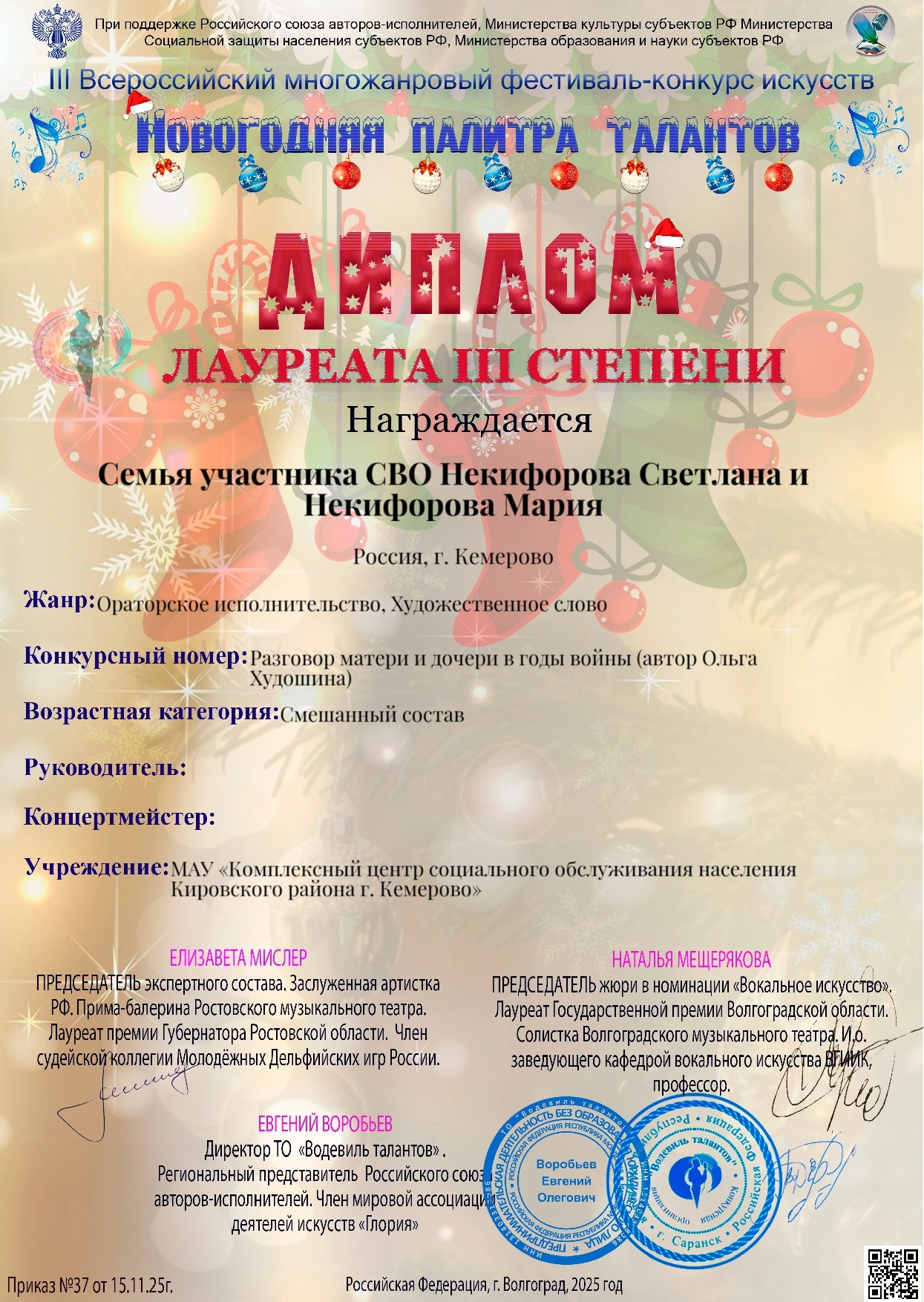 Поздравляем лауреатов III Всероссийского фестиваля-конкурса «Новогодняя палитра талантов».Буглеев Денис, получатель социальных услуг МАУ КЦСОН  (Диплом II степени) — в номинации вокальное искусство и семья участника СВО Никифоровы Светлана и Мария  (Диплом III степени) — в номинации ораторское исполнительство. Благодарственное письмо направлено Кручининой Ольге Коминтерновне, культ-организатору, за профессиональную работу и подготовку участников к конкурсу.
