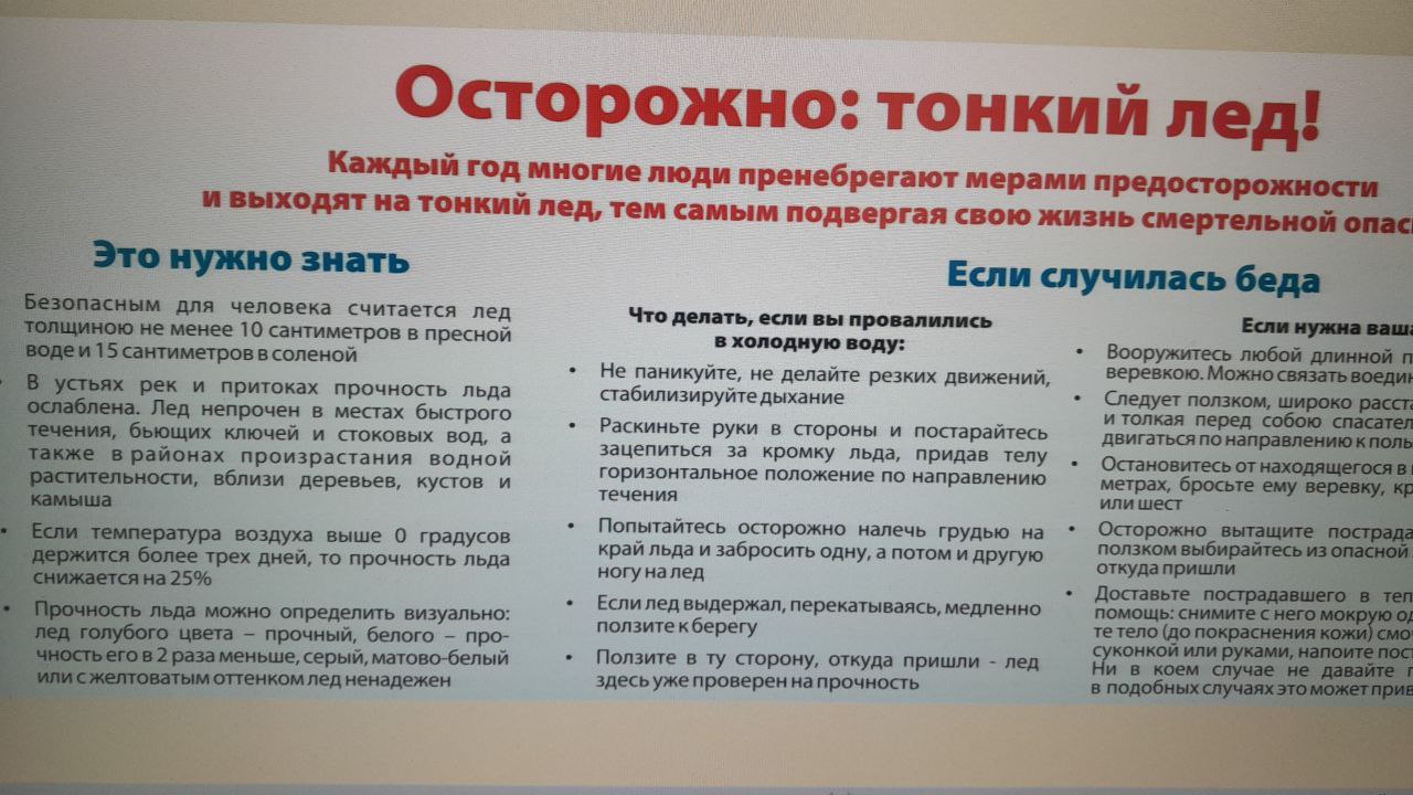 13 ноября с получателями социальных услуг отделения дневного пребывания состоялась беседа на тему: «Осторожно, тонкий лед!», на которой гражданам пожилого возраста напомнили о правилах безопасного поведения вблизи водоемов в холодное время года.